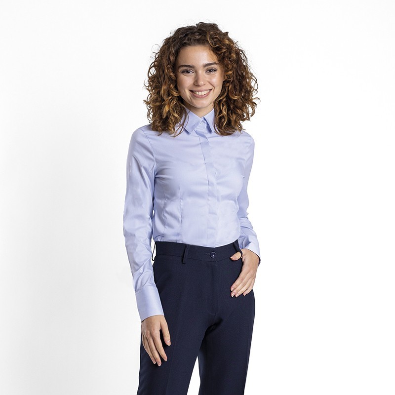 Blusa señora bistretch manga larga, entallada, cuello camisero.