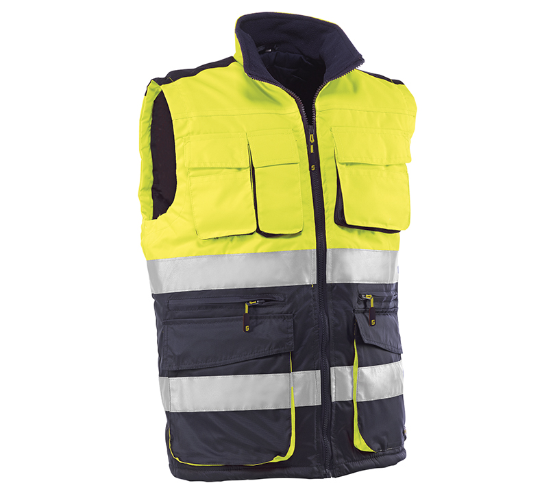 CHALECO MULTIBOLSILLOS CON BANDAS REFLECTANTES 3M®, ACOLCHADO. AMARILLO FLÚOR/MARINO (COD.:HV717)