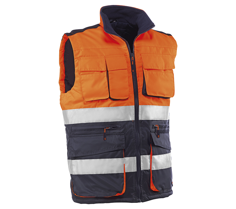 CHALECO MULTIBOLSILLOS CON BANDAS REFLECTANTES 3M®, ACOLCHADO. NARANJA FLÚOR/MARINO (COD.:HV718)