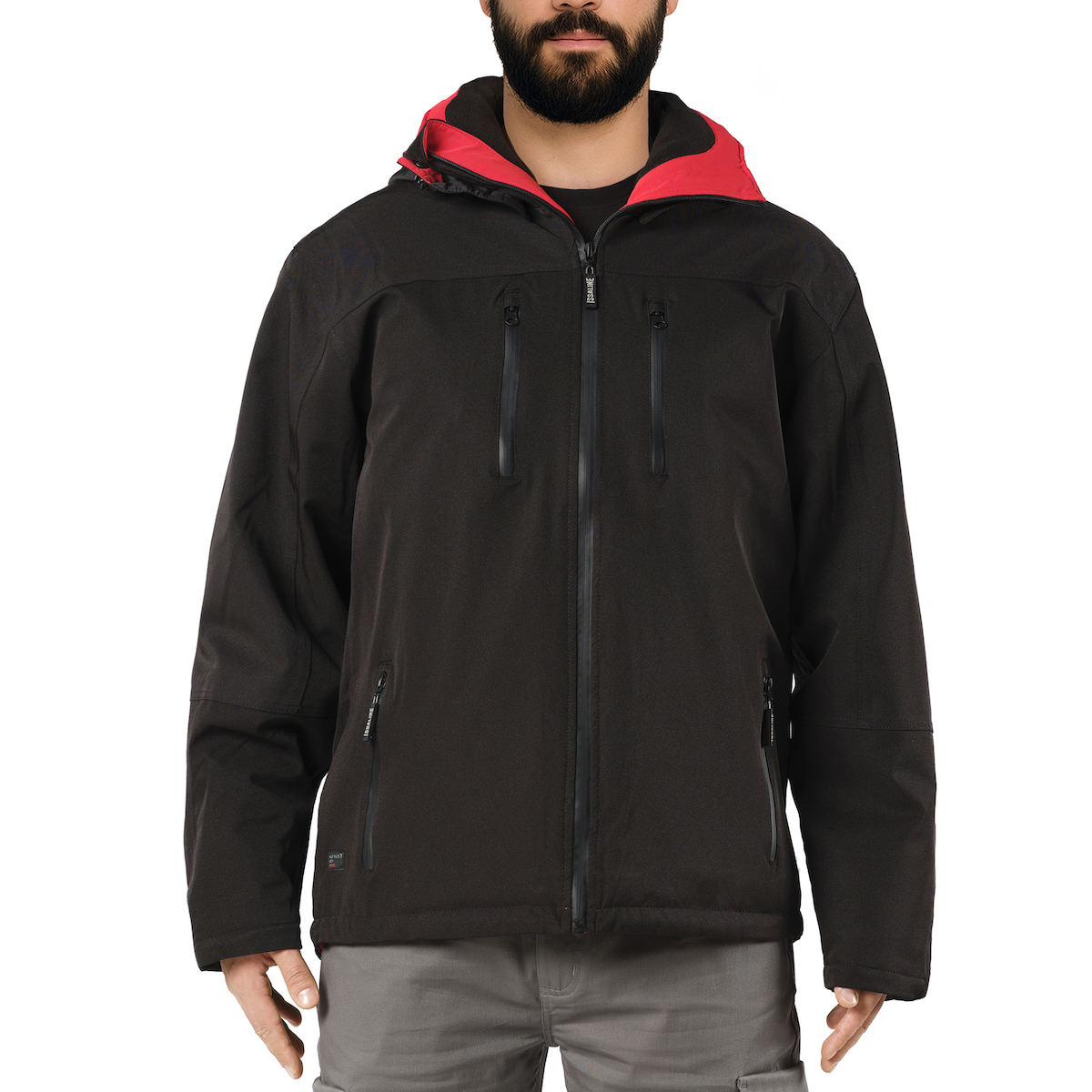 Softshell acolchado con cinco bolsillos exteriores con cremalleras selladas y dos bolsillos interiores.