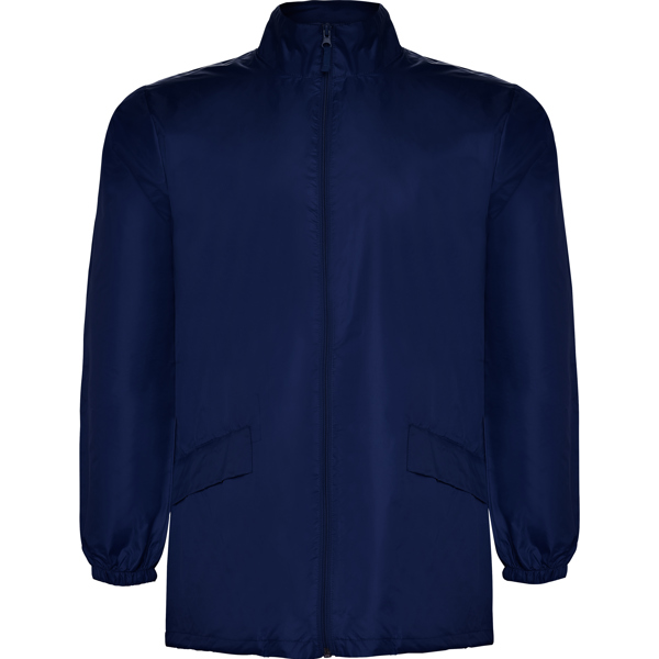 Chubasquero unisex. Cuello alto y capucha extraíble con cordones ajustables. Cremallera central al tono con tirador. Dos bolsillos laterales con solapa. Puños elásticos. Bajo con cordones ajustables en interior. Goma elástica en el interior del bolsillo para su plegado y guardado.