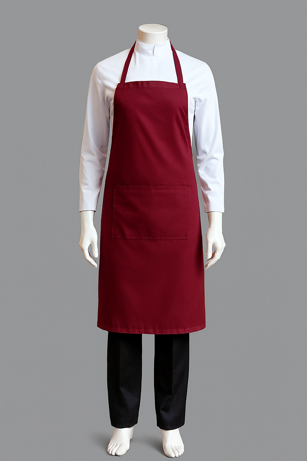 Delantal con peto, bolsillo central partido, tiras para atar regulables.