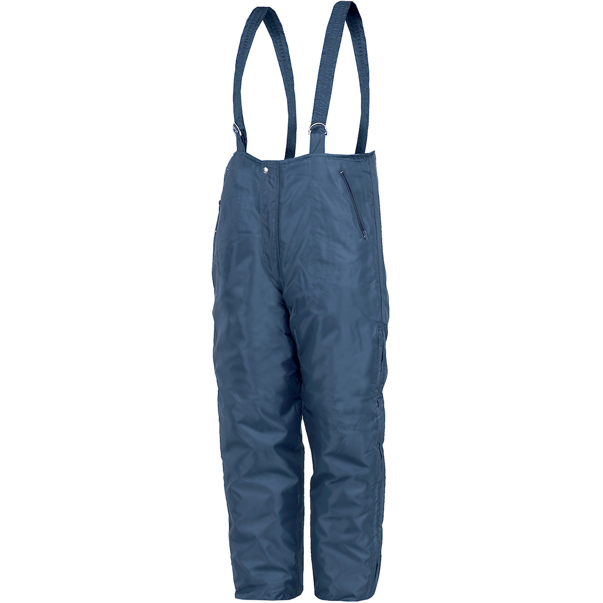 Pantalón grueso acolchado con tirantes elásticos ajustables en los hombros, dos bolsillos con cremallera, cierre de cremallera frontal, apertura lateral larga con cremallera, elástico en la parte inferior de la pierna para sujetarlo a los zapatos.