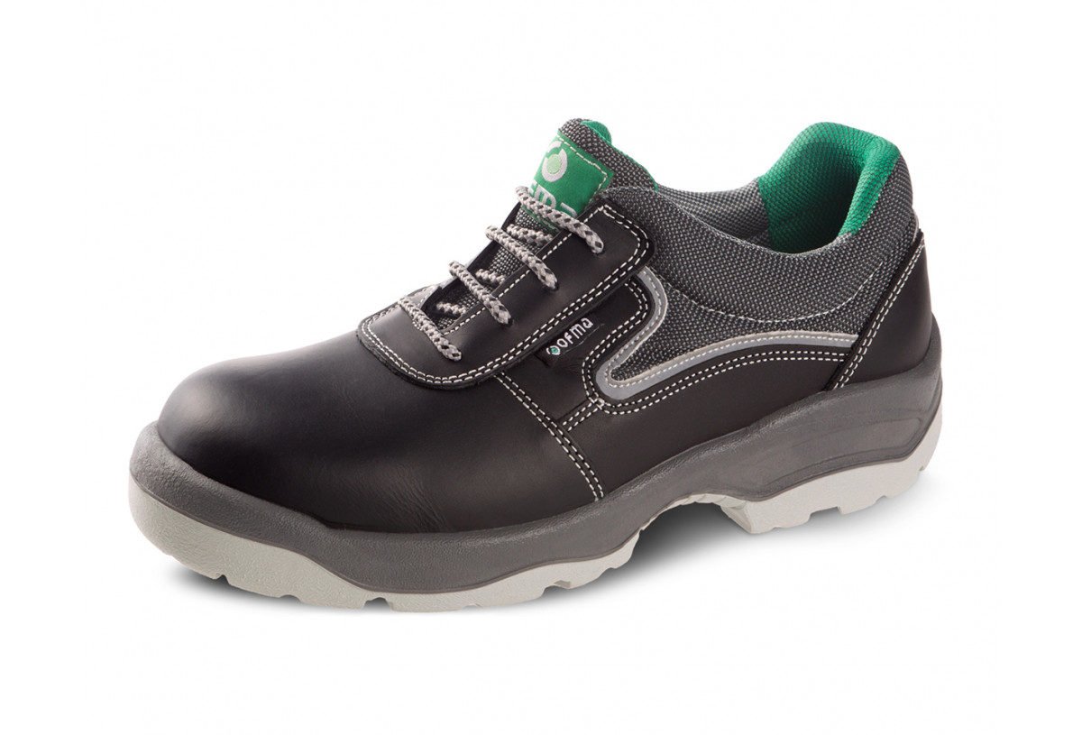 Zapato de piel negra lisa e hidrofugada y cuello en tejido de poliamida 100 % impermeable. Incorpora puntera de fibra de vidrio y plantilla antiperforación textil.Suela de PU2D que protege el talón y disminuye la sensación de cansancio. Aislamiento al calor y frío y resistencia a las flexiones repetidas.Suela bicolor extremadamente ligera y cómoda.Protege el talón y disminuye la sensación de cansancio.Gran resistencia a las flexiones repetidas.Aislamiento al frío y al calor.Amplios canales de evacuación de líquidos.